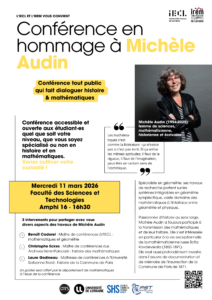 L’IECL et l’IREM vous invitent à une conférence en hommage à Michèle Audin (1954–2025), mathématicienne, historienne et écrivaine, dont l’œuvre a fait dialoguer avec exigence mathématiques et histoire.