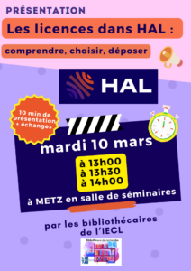 Pour en savoir plus sur les licences proposées par HAL, les bibliothécaires de l’IECL vous invitent à une présentation sur ‘les licences dans HAL : comprendre, choisir, déposer ‘en salle de conférence, à l’IECL Metz, ce mardi 10 mars 2026 aux trois horaires suivants 13h00/13h30/14h00 :